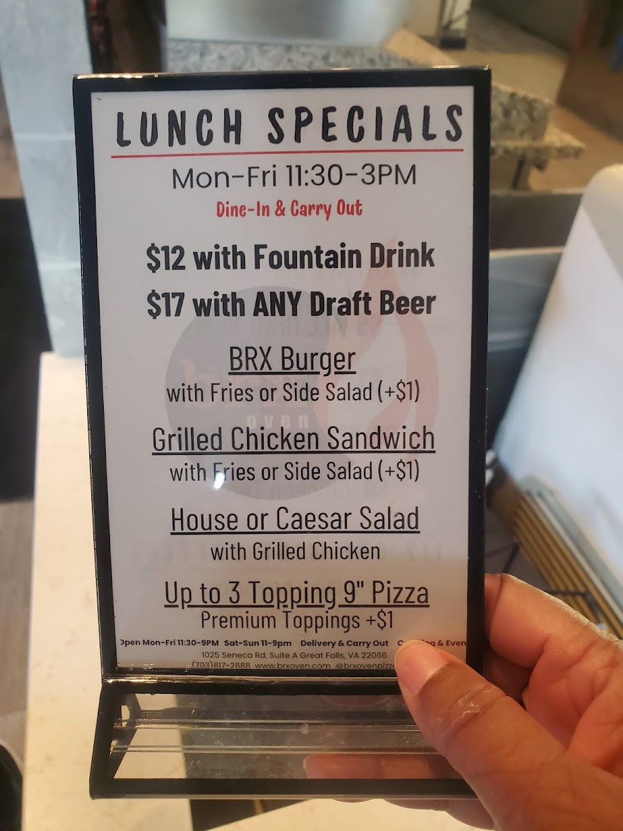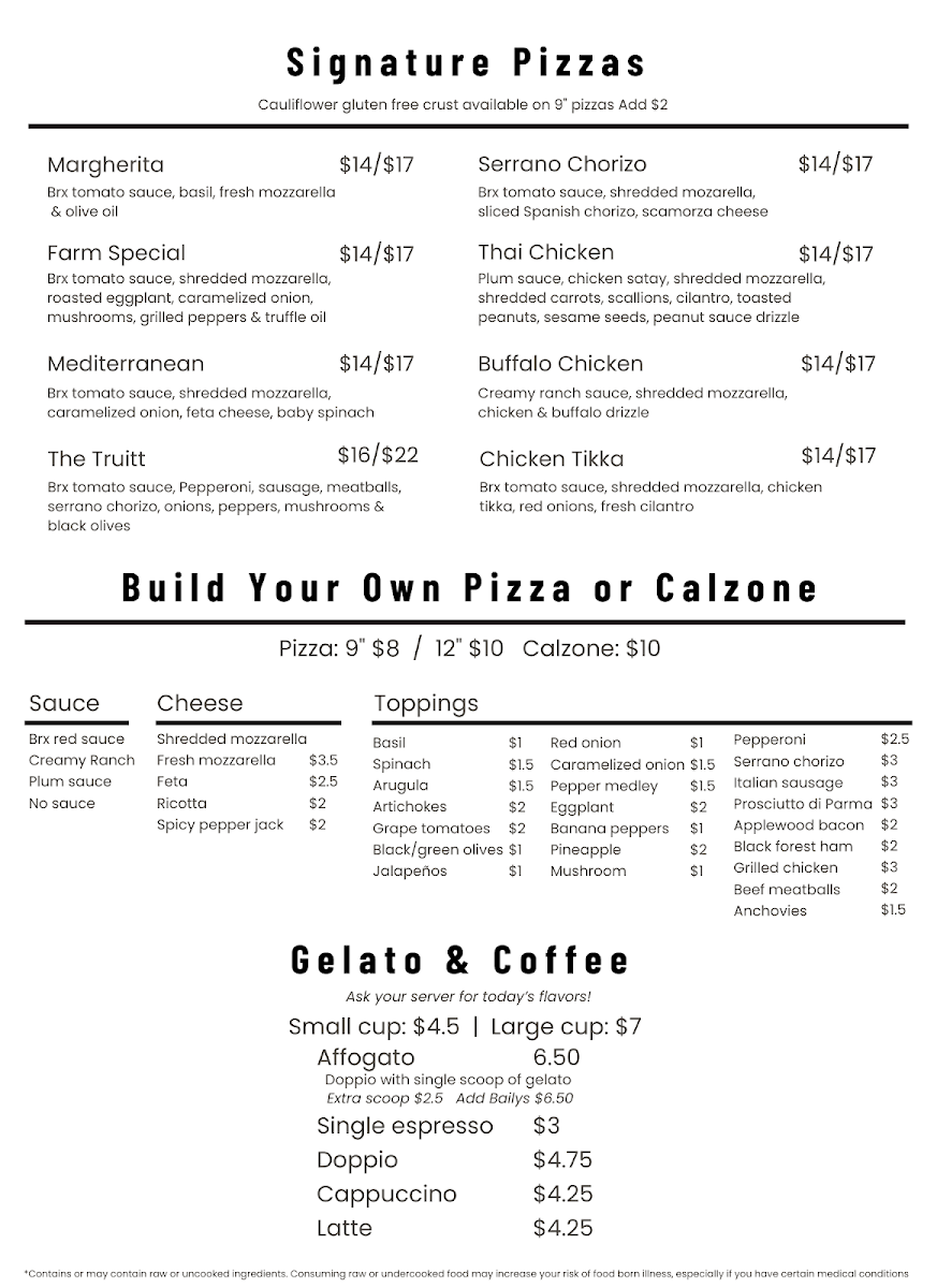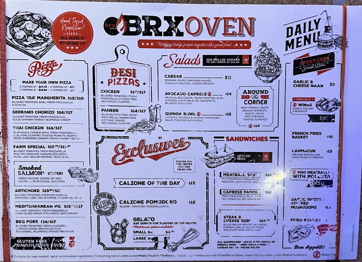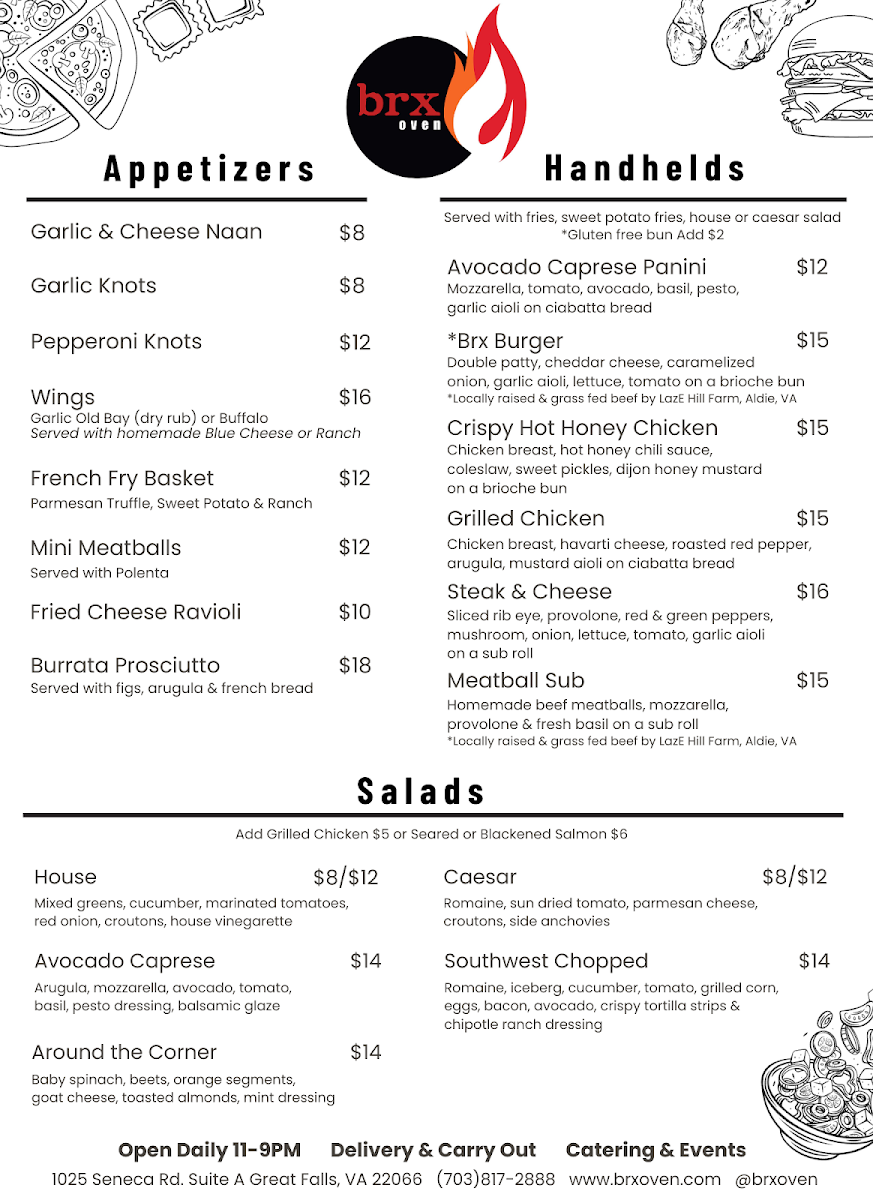 Brx Oven in Great Falls offers a diverse and mouthwatering menu, perfect for anyone craving comforting and flavorful dishes. Starting with appetizers, guests can indulge in Cheesy Garlic Bread or the Pepperoni Pizza Roll, and for something a bit more unique, the Fried Fresh Mozzarella and Avocado Bruschetta are standout choices. The handheld section includes a variety of sandwiches, such as the crispy Hot Honey Chicken Handheld, Avocado Caprese Panini, and the classic BRX Burger. Salads like the House Salad and Caesar Salad provide refreshing options, while the Southwest Chopped Salad and Avocado Caprese Salad add a more robust flavor profile. For pizza lovers, the Pizza of the Month is available in both 9" and 14" sizes, alongside the timeless Margherita Pizza and Farm Special Pizza. The Build Your Own Pizza option also offers the flexibility of a 9" or 14" pie, with the option for a Cauliflower Crust. Pasta enthusiasts can delight in the Build Your Own Homemade Pasta, where customization is key. To pair with your meal, the coffee selection includes classic options like Espresso, Cappuccino, and Latte, and dessert lovers can enjoy an Affogato or indulge in Gelato by Dolce Gelati. For kids, there's a tasty selection, including Kids Cheese Pizza and Kids Spaghetti & Meatballs. On the side, diners can enjoy Fries, Sliced Avocado, and even an Ice Cream Cone for dessert. With a menu that caters to a variety of tastes and preferences, Brx Oven is a great choice for a casual yet delicious dining experience.